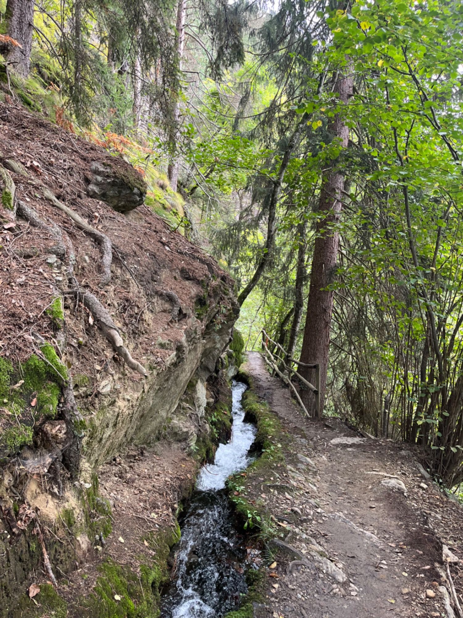Egal. Ich bin am Tiroler Kreuz ausgestiegen und rauf auf meinen absoluten Lieblingswaalweg gestiegen. Der Kuenser Waalweg. Das ist einer der schönsten weit und breit. Er fließt weitgehgend in einem natürlichen Bett. Es plätschert unentwegt neben einem und es geht bequem dahin auf einem schmalen aber gut zu gehenden Pfad. Er ist nicht überlaufen und obendrein geht es mal durch den Wald, mal durch offenes Gelände. Nachteil: Keine Einkehr weit und breit - nur Waal.